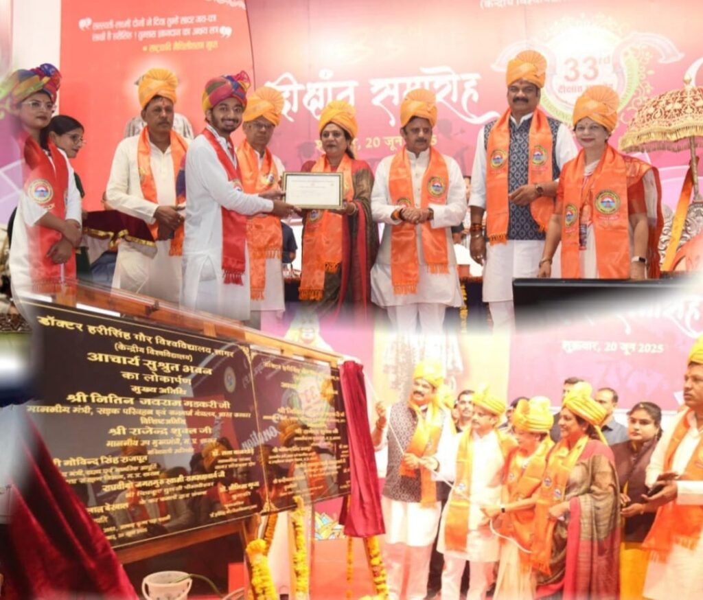 सागर। 22 जून 2025 को डॉ. हरिसिंह गौर केंद्रीय विश्वविद्यालय, सागर में 33वां दीक्षांत समारोह गौर प्रांगण में भव्य रूप से आयोजित किया गया। इस अवसर पर तुलसीपीठाधीश्वर, पद्मविभूषण जगद्गुरु स्वामी रामभद्राचार्य जी का दिव्य सान्निध्य प्राप्त हुआ, जिन्हें विश्वविद्यालय ने मानद डी.लिट. उपाधि से सम्मानित किया। समारोह में केंद्रीय सड़क परिवहन और राजमार्ग मंत्री नितिन गडकरी ने वर्चुअल रूप से मार्गदर्शन प्रदान किया। मध्य प्रदेश के उपमुख्यमंत्री राजेंद्र शुक्ल, कैबिनेट मंत्री गोविंद सिंह राजपूत, सागर सांसद डॉ. लता वानखेड़े, विधायक वीरेंद्र सिंह लोधी, और कुलपति प्रो. नीलिमा गुप्ता सहित अनेक गणमान्य व्यक्ति, शिक्षक, और छात्र उपस्थित रहे।