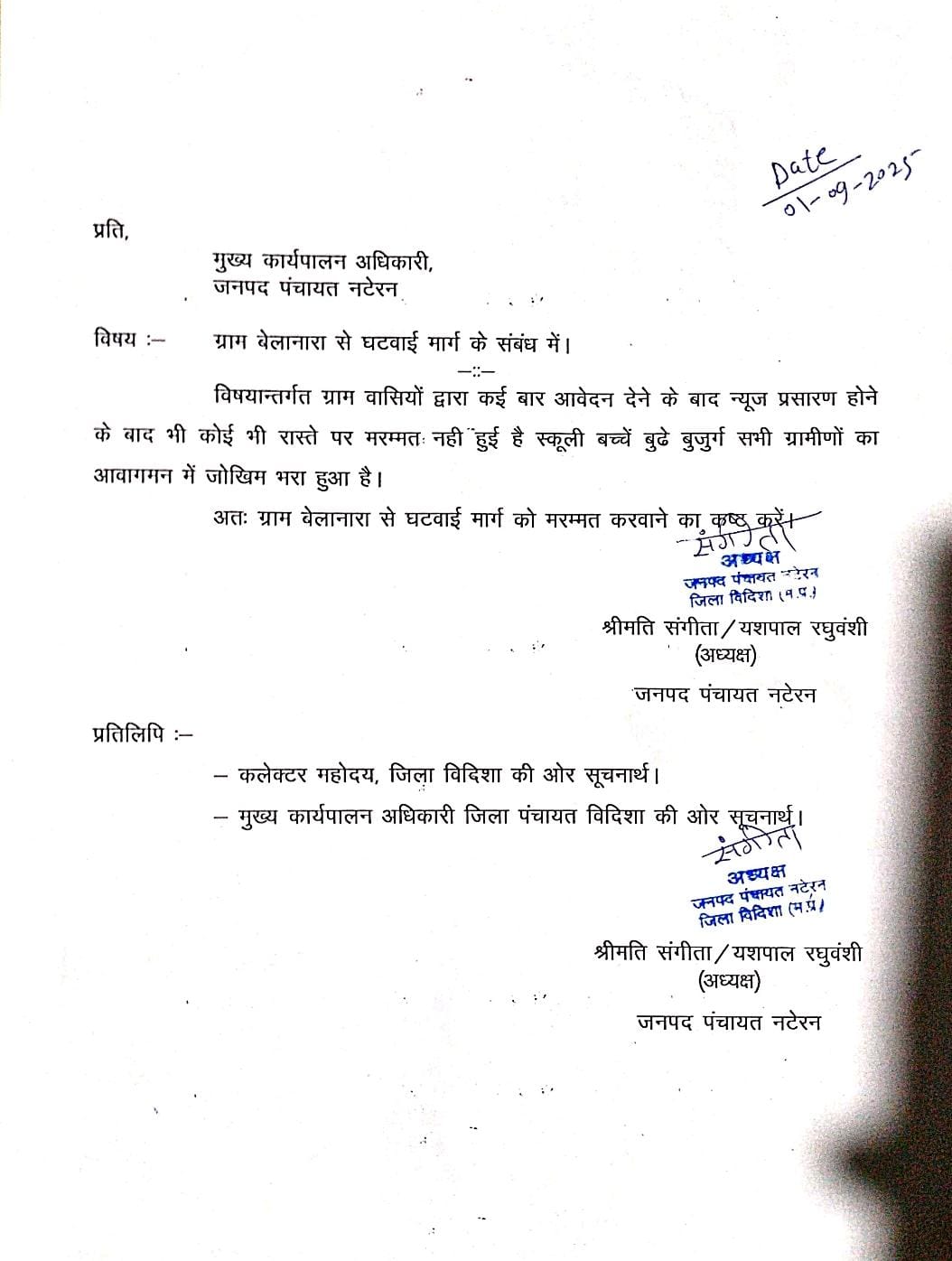 ग्रामीणों ने बताया कि उन्होंने इस समस्या को लेकर प्रधानमंत्री नरेंद्र मोदी के नाम पत्र लिखा है और स्पीड पोस्ट के माध्यम से भेजा है। साथ ही तहसीलदार आनंद जैन को सौंपे ज्ञापन में स्पष्ट कहा गया है कि यदि तीन दिन के भीतर सड़क के गड्ढे भरने का कार्य प्रारंभ नहीं किया गया, तो वे उग्र आंदोलन करने के लिए बाध्य होंगे।