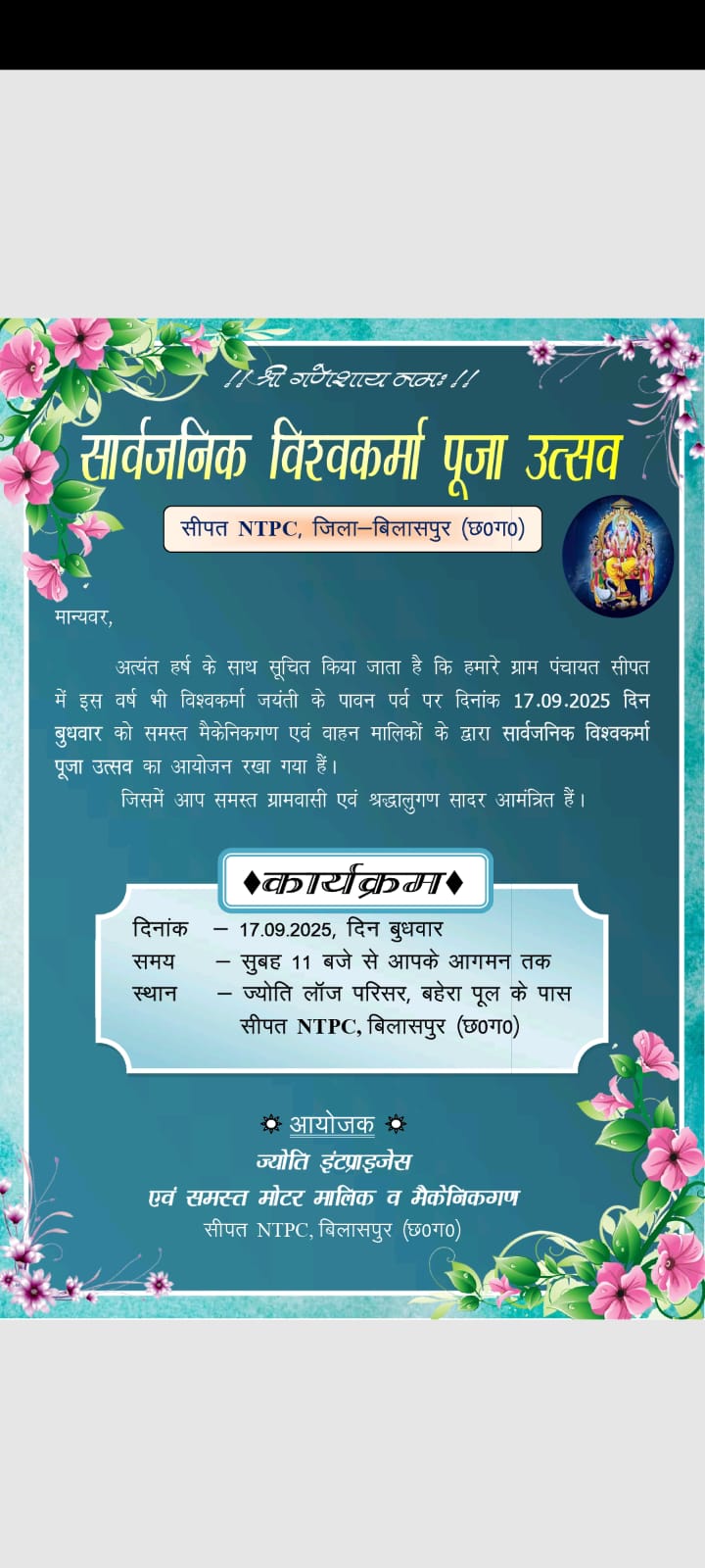 सीपत। ऊर्जा नगरी सीपत में इस वर्ष भी देव शिल्पी विश्वकर्मा जयंती बड़े ही धूमधाम और हर्षोल्लास के साथ मनाई जाएगी। समस्त मोटर मालिक संघ एवं मैकेनिक संघ के तत्वावधान में यह आयोजन 17 सितंबर को ज्योति लॉज परिसर में किया जाएगा।