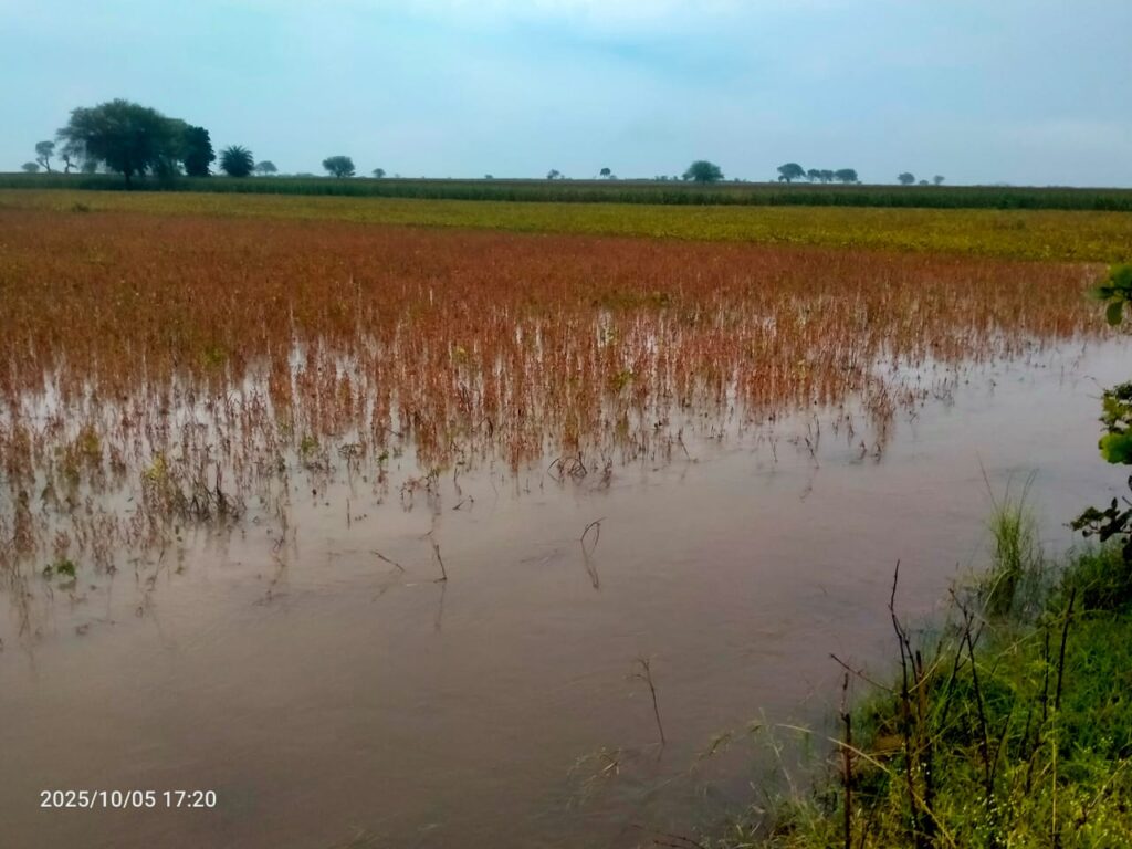 नटेरन/विदिशा। नटेरन क्षेत्र में शनिवार और रविवार को हुई भारी बारिश ने किसानों की सोयाबीन फसल को भारी नुकसान पहुंचाया है। क्षेत्र के कई गांवों में कटी हुई सोयाबीन की फसल खराब हो गई, जिससे किसान बेहद परेशान हैं। रविवार दोपहर 3:00 बजे से शाम 6:00 बजे तक हुई तेज बारिश से खेत जलमग्न हो गए, और कटी हुई फसल पानी में बहने लगी। अक्टूबर माह में इतनी भारी बारिश ने किसानों की उम्मीदों पर पानी फेर दिया है, और अब हार्वेस्टर पहुंचने में भी दिक्कत हो रही है।