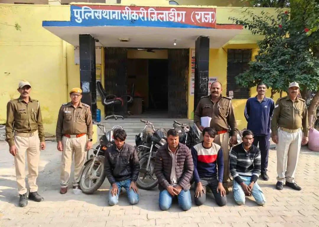 डीग – डीग जिले की सीकरी थाना पुलिस ने वाहन चोरों के गिरोह का भंडाफोड़ करते हुए चार आरोपियों को गिरफ्तार कर उनके कब्जे से चोरी की चार बाइके जब्त की हैं। सीकरी थानाधिकारी मुकेश चेची ने बताया कि गिरफ्तार किए गए आरोपियों में काबान का बास निवासी मुस्ताक पुत्र जुम्मा, चोर गढ़ी निवासी कल्लू उर्फ जमशेद पुत्र नजीर, रायपुर निवासी हकमू उर्फ हकमुद्दीन पुत्र छुट्टन और गांवड़ी जुरहरा निवासी सद्दा उर्फ सद्दाम पुत्र आकूप शामिल हैं। थानाधिकारी ने बताया कि क्षेत्र में लगातार हो रही बाइक चोरी की घटनाओं को देखते हुए वाहन चोरों को पकड़ने के लिए एएसआई हरवीर सिंह के नेतृत्व में एक विशेष टीम का गठन किया गया था। एएसआई हरवीर सिंह को सूचना मिली कि रूपवास-कोलरी के पहाड़ की तलहटी पर कुछ बाइक चोर मौजूद हैं। इस सूचना डीएसटी टीम प्रभारी सुल्तान सिंह के साथ अपनी टीम लेकर बताए गए स्थान पर पहुंचे। पुलिस को देखकर चार युवक भागने लगे, जिन्हें घेराबंदी कर पकड़ लिया गया। पकड़े गए युवकों के पास खड़ी चार मोटरसाइकिलों के बारे में पूछने पर आरोपियों ने उन्हें चोरी का बताया। इसके बाद पुलिस ने चारों बाइकों को जब्त कर सभी आरोपियों को गिरफ्तार कर लिया। एसएचओ ने बताया कि पकड़े गए सभी आरोपी कुख्यात वाहन चोर हैं। पुलिस को इनसे क्षेत्र में हुई कई अन्य चोरी की वारदातों का खुलासा होने की उम्मीद है।