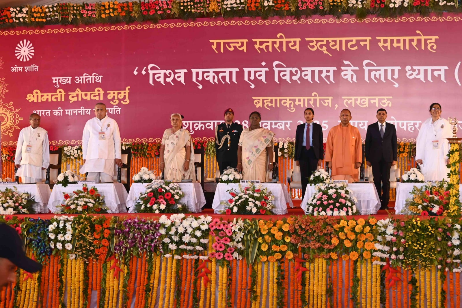 लखनऊ। राष्ट्रपति द्रौपदी मुर्मु ने शुक्रवार (28 नवंबर 2025) को लखनऊ के सुल्तानपुर रोड स्थित ब्रह्माकुमारी गुलजार उपवन राजयोग ट्रेनिंग सेंटर में ब्रह्माकुमारी संस्था की वार्षिक थीम “विश्व एकता और विश्वास के लिए ध्यान (योग)” का उत्तर प्रदेश स्तर पर भव्य शुभारंभ किया। कार्यक्रम में राष्ट्रपति ने ब्रह्माकुमारी बहनों को दिव्य कलश प्रदान कर और दीप प्रज्ज्वलन कर अभियान की शुरुआत की। इस अवसर पर राज्यपाल आनंदीबेन पटेल, मुख्यमंत्री योगी आदित्यनाथ सहित शहर के 3,000 से अधिक गणमान्य नागरिक, डॉक्टर, प्रशासनिक अधिकारी और व्यवसायी उपस्थित रहे।