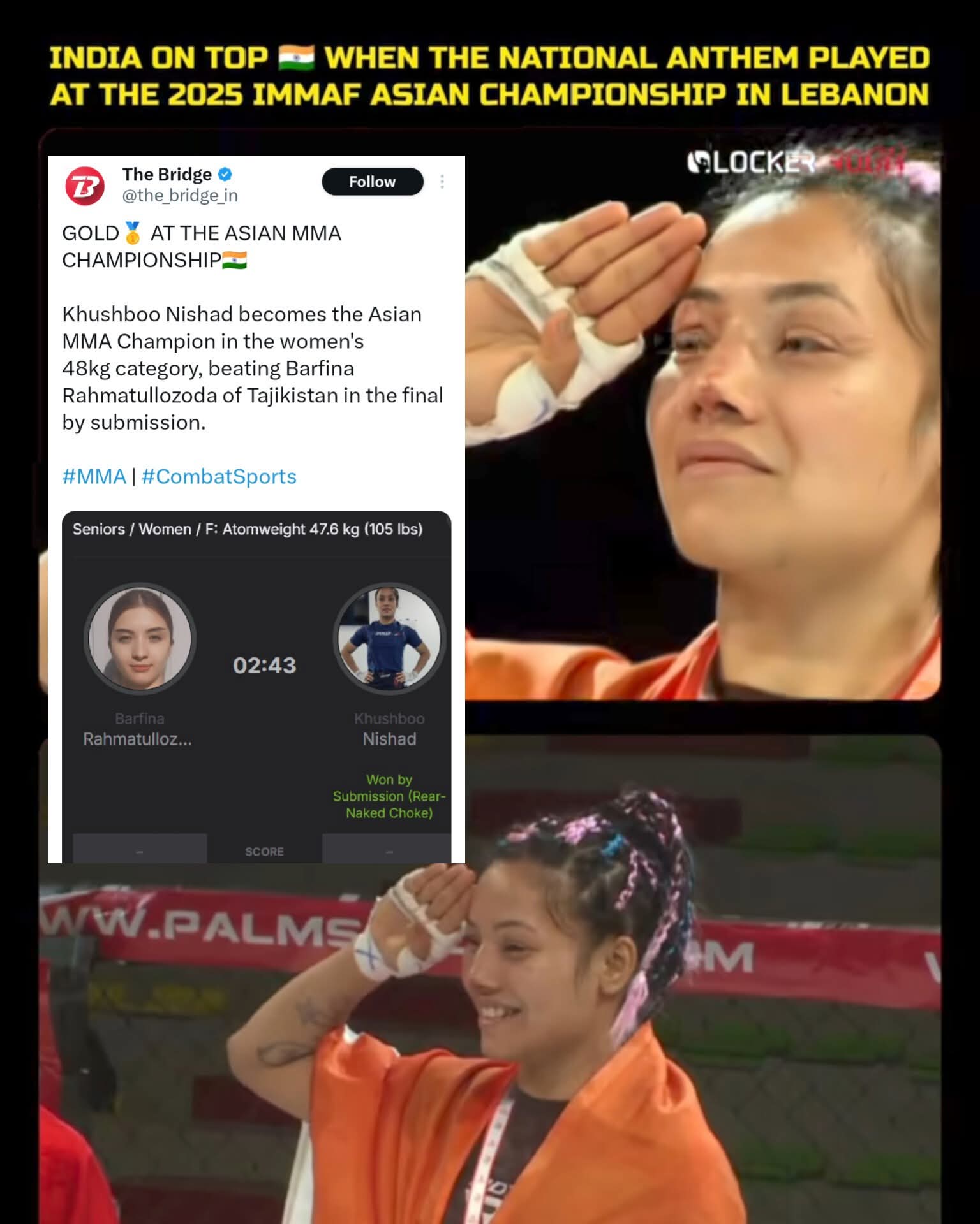 यह भारत के लिए मिक्स्ड मार्शल आर्ट्स में अब तक का पहला गोल्ड मेडल है। इससे पहले न तो पुरुष वर्ग और न ही महिला वर्ग में भारत किसी अंतरराष्ट्रीय IMMAF टूर्नामेंट में स्वर्ण पदक जीत सका था।