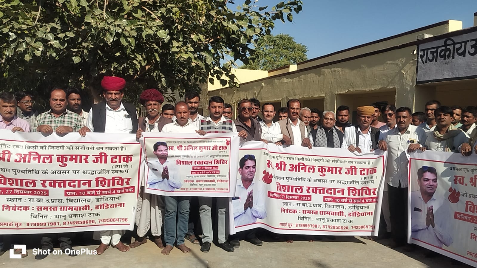 थावला के नजदीकी ग्राम डोडियाना मेंआज विशाल रक्तदान शिविर को लेकर पोस्टर विमोचन का आयोजन किया गया।आदरणीय पूज्य गुरुदेव श्री अनिल कुमार टाक की पुण्य स्मृति में आने वाली 27 दिसंबर 2025 को विशाल रक्तदान शिविर का आयोजन समस्त ग्राम वासियों के सहयोग से किया जा रहा है