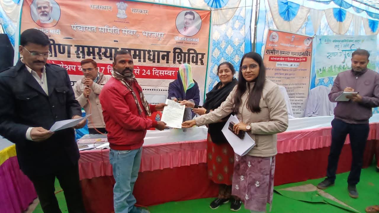 भरतपुर – राज्य सरकार के दो वर्ष पूर्ण होने के अवसर पर आयोजित ग्रामीण समस्या समाधान शिविरों के तहत संभागीय आयुक्त नलिनी कठोतिया ने सेवर पंचायत समिति की ग्राम पंचायत हथैनी व धौरमुई में शिविरों का औचक निरीक्षण किया। उन्होंने विभिन्न विभागों की प्रगति की समीक्षा करते हुए पात्रजनों को योजनाओं का अधिकतम लाभ दिलाने के निर्देश दिए। संभागीय आयुक्त ने जिला परिषद के नवाचार दृष्टि दीदी अभियान के अंतर्गत ग्रामीण महिलाओं की नेत्र जांच पहल की सराहना करते हुए अधिकाधिक महिलाओं को लाभान्वित करने पर जोर दिया। उन्होंने चिकित्सा विभाग को टीबी स्क्रीनिंग में तेजी, महिला एवं बाल विकास विभाग को मातृ वंदना योजना, सामाजिक न्याय विभाग को पालनहार व पेंशन योजनाओं के प्रभावी क्रियान्वयन के निर्देश दिए। धौरमुई शिविर में विभिन्न जनकल्याणकारी योजनाओं के तहत बीमा, पेंशन, खाद्य सुरक्षा, स्वामित्व, राजस्व एवं स्वास्थ्य से जुड़े कई प्रकरणों का मौके पर निस्तारण किया गया। हथैनी शिविर में भी किसान, पशुपालक एवं आमजन को योजनाओं का लाभ पहुंचाया गया। निरीक्षण के दौरान संभागीय आयुक्त ने पात्र लाभार्थियों को स्वामित्व योजना के पट्टे एवं मुख्यमंत्री मंगला पशु बीमा योजना के कार्ड वितरित किए। इस अवसर पर प्रशासनिक अधिकारी, जनप्रतिनिधि एवं बड़ी संख्या में ग्रामीण उपस्थित रहे।