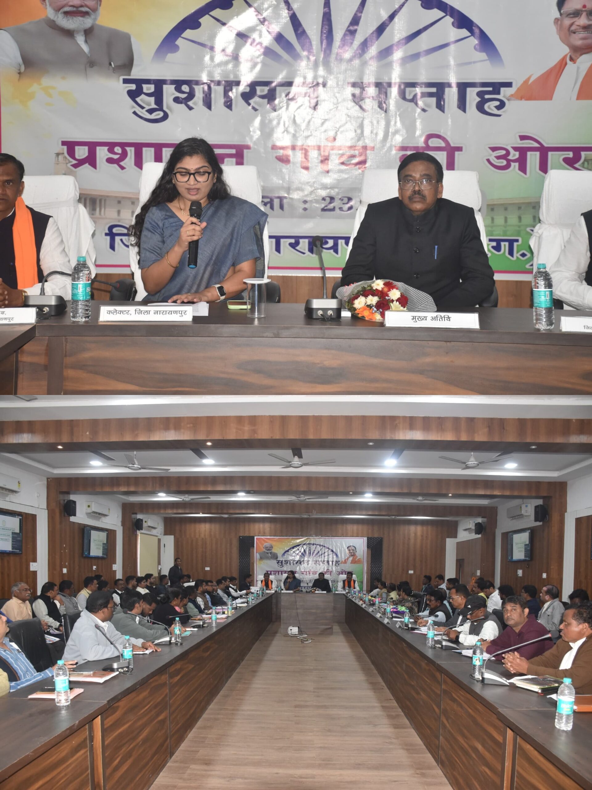 नारायणपुर, 23 दिसम्बर 2025// प्रशासन गांव की ओर अभियान के तहत केन्द्र एवं राज्य शासन की शासकीय योजनाओं का लाभ जिले के अंतिम व्यक्ति तक पहुंचाना है। सुशासन सप्ताह-प्रशासन गांव की ओर अभियान के तहत् जिले के ग्राम पंचायतों में शिविर का आयोजन किया जा रहा है। शिविर में प्राप्त होने वाले आवेदनों का निराकरण संबंधित विभागों द्वारा किया जा रहा है। शिविर में शासकीय योजनाओं का ग्रामीणजनों तक पहुंच सुनिश्चित करना है, जिसके तहत् आज जिला पंचायत के सभा कक्ष में पूर्व कमिश्नर दिलीप वासनिकर के आतिथ्य में सुशासन सप्ताह कार्यक्रम आयोजित किया गया।