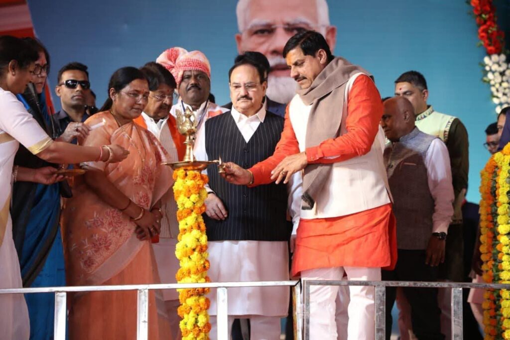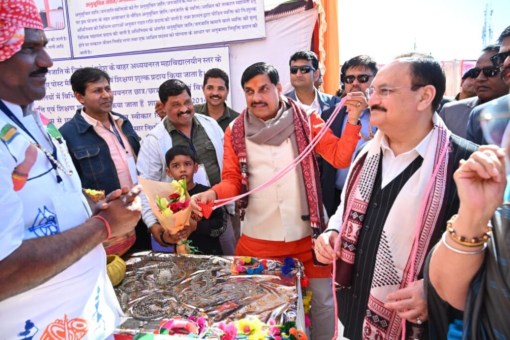 केंद्रीय मंत्री श्री जेपी नड्डा जी और मुख्यमंत्री डॉ मोहन यादव का सभा स्थल आगमन पर पारंपरिक ढोल मांदल व नृत्य के साथ स्वागत किया गया। मंच पर मुख्य अतिथियों का स्वागत जिले के ‘‘एक जिला-एक उत्पाद’’ के तहत बाग प्रिंट से बने वस्त्र से किया। मुख्य अतिथियों द्वारा दीप प्रज्वलन कर कार्यक्रम का शुभारंभ किया गया।