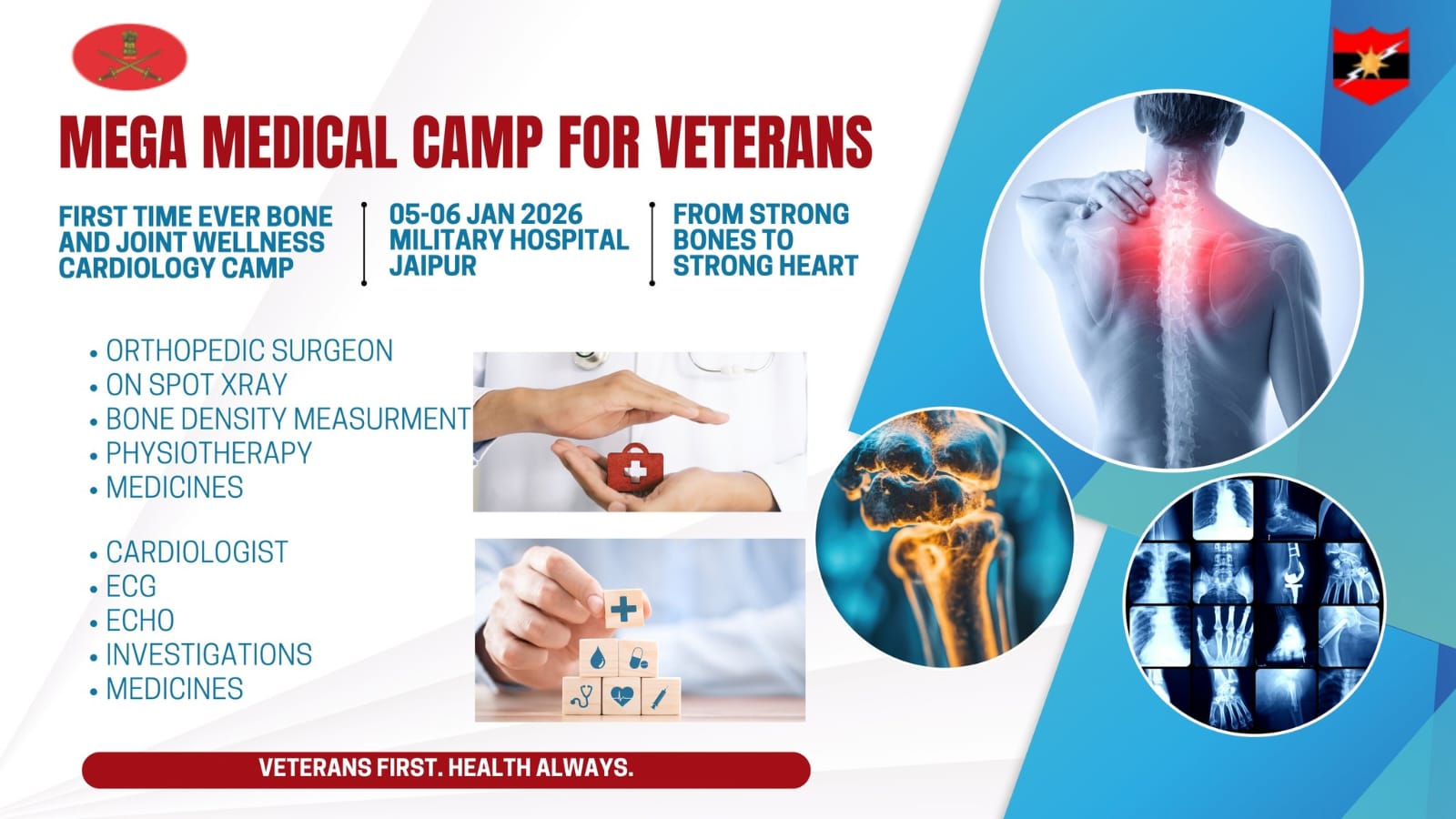मिलिट्री अस्पताल जयपुर को यह घोषणा करते हुए गर्व हो रहा है कि वह आगामी सेना दिवस समारोहों की पूर्व संध्या पर पूर्व सैनिकों के लिए पहली बार एक मेगा मेडिकल कैंप का आयोजन कर रहा है। यह मेगा मेडिकल कैंप 05 एवं 06 जनवरी 2026 को आयोजित किया जाएगा जिसमें हड्डी एवं जोड़ स्वास्थ्य तथा समग्र हृदय रोग देखभाल पर विशेष ध्यान दिया जाएगा। इस कैंप के माध्यम से एक ही स्थान पर विश्वस्तरीय चिकित्सा सेवाएं उपलब्ध कराई जाएंगी। यह अभिनव पहल भारतीय सेना की अपने पूर्व सैनिकों के कल्याण के प्रति अटूट प्रतिबद्धता को दर्शाती है। इस आयोजन में सैन्य अस्पतालों के अनुभवी विशेषज्ञों के साथ-साथ प्रतिष्ठित सिविल चिकित्सा संस्थानों के विशेषज्ञ भी भाग लेंगे जिससे पूर्व सैनिकों को निशुल्क एक ही स्थान पर संपूर्ण चिकित्सीय परीक्षण जांच एवं परामर्श की सुविधा प्राप्त होगी।मेगा मेडिकल कैंप में पूर्व सैनिकों के लिए उन्नत एवं समग्र स्वास्थ्य सेवाएं उपलब्ध कराई जा रही हैं। कैंप के अंतर्गत हड्डी एवं जोड़ स्वास्थ्य क्लीनिक में तत्काल एक्स-रे सुविधा बोन मिनरल डेंसिटी जांच तथा मिलिट्री एवं अग्रणी सिविल अस्पतालों के प्रसिद्ध अस्थि रोग विशेषज्ञों द्वारा परामर्श प्रदान किया जाएगा। इसके साथ ही जोड़ एवं रीढ़ की मजबूती के लिए व्यायामों का लाइव प्रदर्शन किए जाएंगे। इसके अतिरिक्त समग्र हृदय रोग देखभाल सेवाओं के अंतर्गत अनुभवी हृदय रोग विशेषज्ञों द्वारा परामर्श स्थल पर ही ईसीजी ईसीएचओ एवं जांच की सुविधा तथा उसी दिन निर्धारित दवाओं का वितरण सुनिश्चित किया जाएगा जिससे मरीजों को त्वरित सुलभ और गुणवत्तापूर्ण उपचार एक ही स्थान पर मिल सके।पूर्व सैनिकों के प्रति गहन सम्मान एवं कृतज्ञता के भाव से आयोजित यह मेगा मेडिकल कैंप उनके राष्ट्र के प्रति निस्वार्थ सेवा को सम्मान देते हुए आधुनिक, संवेदनशील एवं गुणवत्तापूर्ण स्वास्थ्य सेवाएं प्रदान करने का प्रयास है।