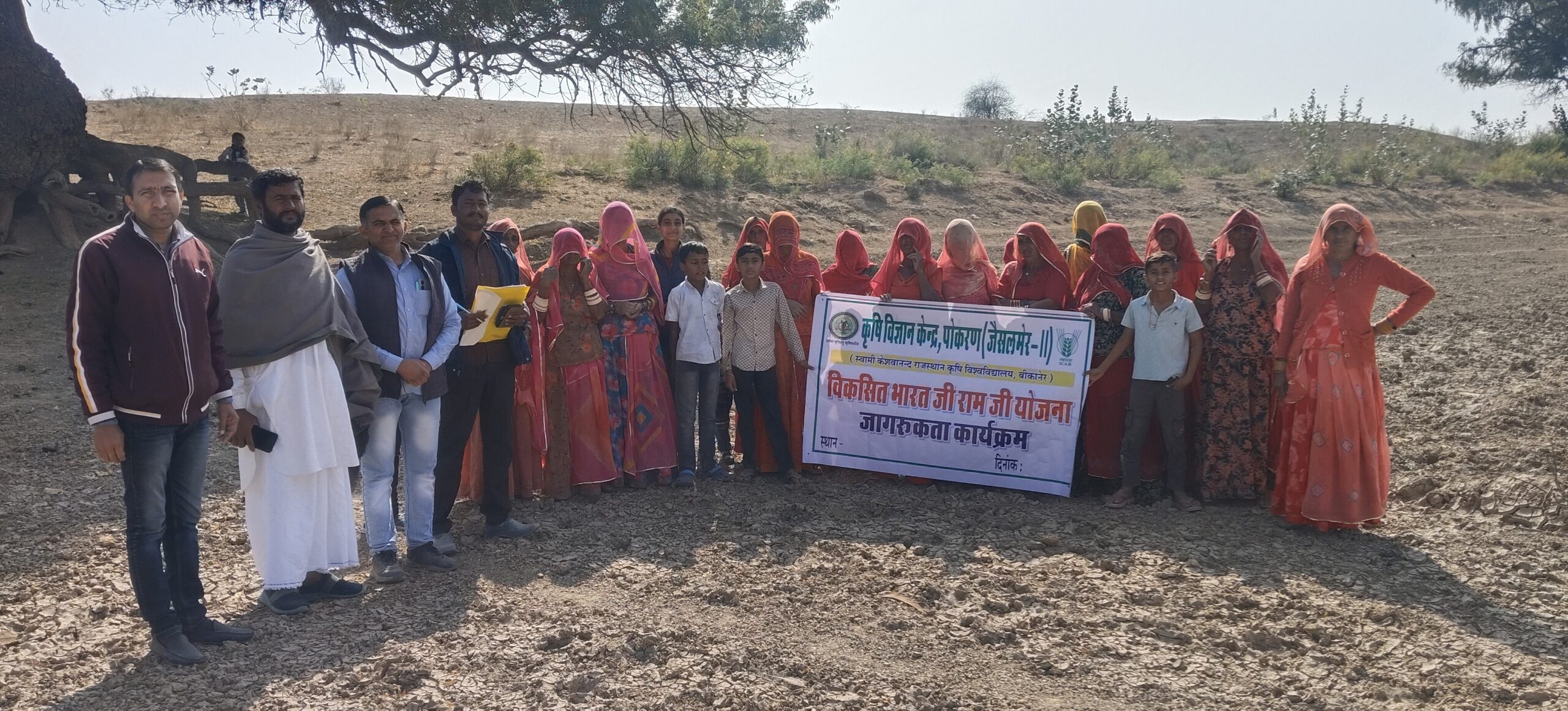 कृषि विज्ञान केन्द्र पोकरण द्वारा ग्राम धौलासर एवं राजमथाई में विकसित भारत- जी राम जी योजना के अंतर्गत जागरूकता अभियान का आयोजन किया गया। जसमें 70 से अधिक किसानों महिलाओं एवं मजदूरों ने भाग लिया। कार्यक्रम का उद्देश्य विकसित भारत गारंटी फॉर रोज़गार एंड आजीविका मिशन के परिलाभों को ग्रामीण लोगों के मध्य प्रचार प्रसार करना है। केन्द्र के वरिष्ठ वैज्ञानिक एवं अध्यक्ष डॉ दशरथ प्रसाद ने बताया कि संसद में पारित विकसित भारत- जी राम जी’ बिल 2025 को राष्ट्रपति द्रौपदी मुर्मु की मंजूरी मिल गई है। अब ये क़ानून बन गया है। यह विकसित भारत गारंटी फॉर रोज़गार एंड आजीविका मिशन ग्रामीण मनरेगा योजना की जगह लेगा। केंद्र के प्रसार वैज्ञानिक सुनील शर्मा ने बताया कि विधेयक का उद्देश्य ग्रामीण आजीविका में बदलाव के माध्यम से श्रमिकों को बेहतर सुरक्षा प्रदान करने कृषि उत्पादकता में सुधार स्थानीय स्तर पर आयोजना बनाने कल्याणकारी योजनाओं को समेकित करने और अग्रिम क्षमता को बढ़ाना है। हर ग्रामीण परिवार को अब साल में 125 दिन काम देने की गारंटी होगी जो पहले 100 दिन थी। इससे गांवों में रहने वाले परिवारों को ज्यादा काम मिलेगा और उनकी आर्थिक सुरक्षा मजबूत होगी। पशुपालन वैज्ञानिक डॉ रामनिवास ने बताया कि यह विधेयक समाज कल्याण को विकसित करने एवं ग्रामीण मजदूरों को आत्मनिर्भरता बढ़ने की ओर एक कदम है। अभियान के तहत विभागों का एकीकरण और पारदर्शिता कृषि मजदूरी समन्वय प्रशासनिक मद में राशि की बढ़ोत्तरी के बारे में ग्रामीणों को जानकारी दी गई। जिससे हर व्यक्ति को इसका लाभ प्राप्त हो सके। ग्राम पंचायत की प्राथमिक कार्यान्वयन भूमिका होगी तथा वह श्रमिकों का पंजीकरण करने ग्रामीण रोजगार गारंटी कार्ड जारी करने तथा कार्यों की प्राथमिकता के आधार पर कम से कम 50 प्रतिशत कार्यों के निष्पादन के लिए उत्तरदायी होगी। अभियान में ग्राम पंचायत धौलासर एवं राजमथाई के कनिष्ठ लिपिक नेमाराम एवं शांति देवी फरीदा पूजा धापू बाकाराम मनोहरसिंह बिरमाराम भोमसिंह मेगसिंह इत्यादि प्रतिभागी उपस्थित रहे।