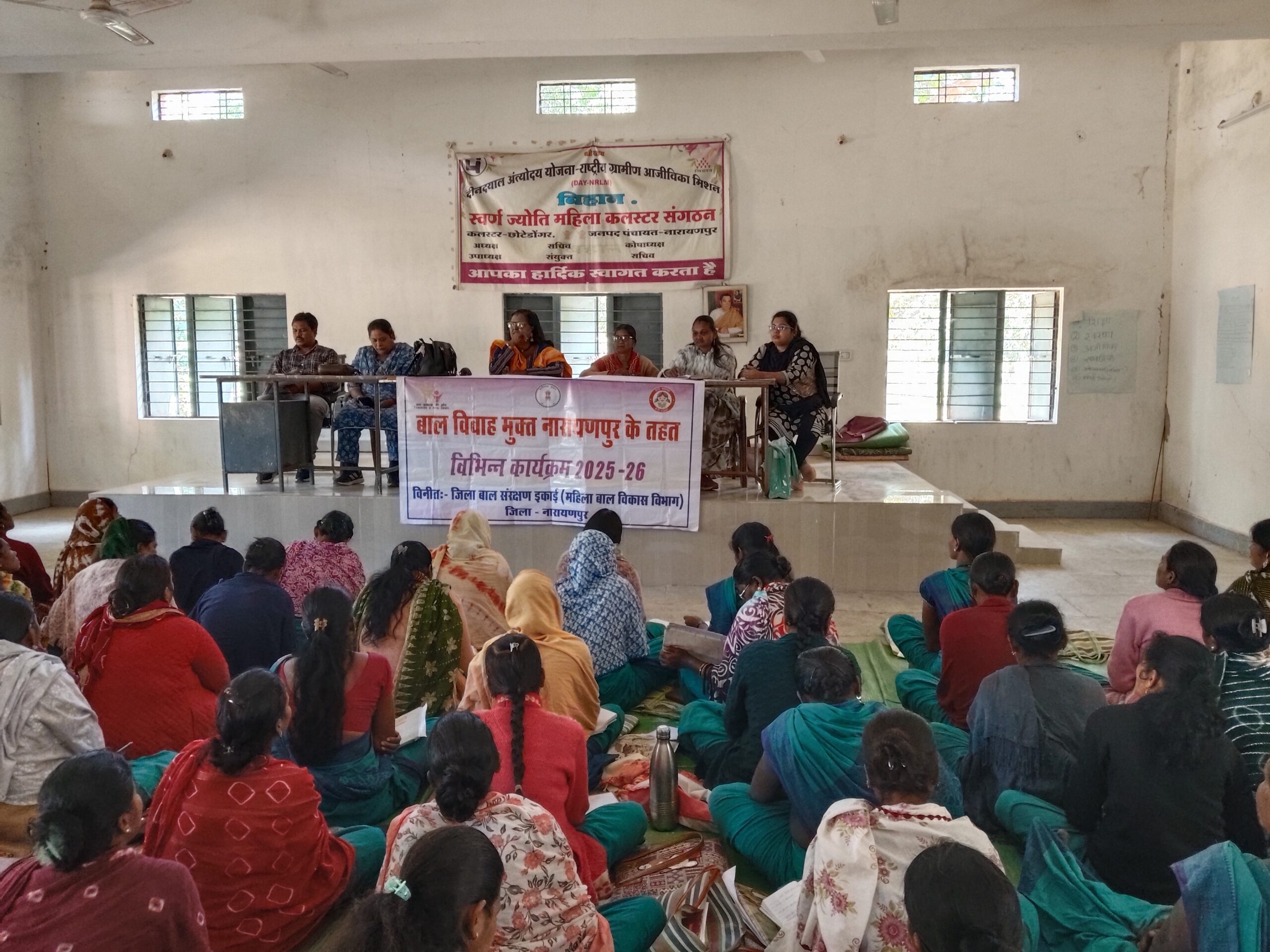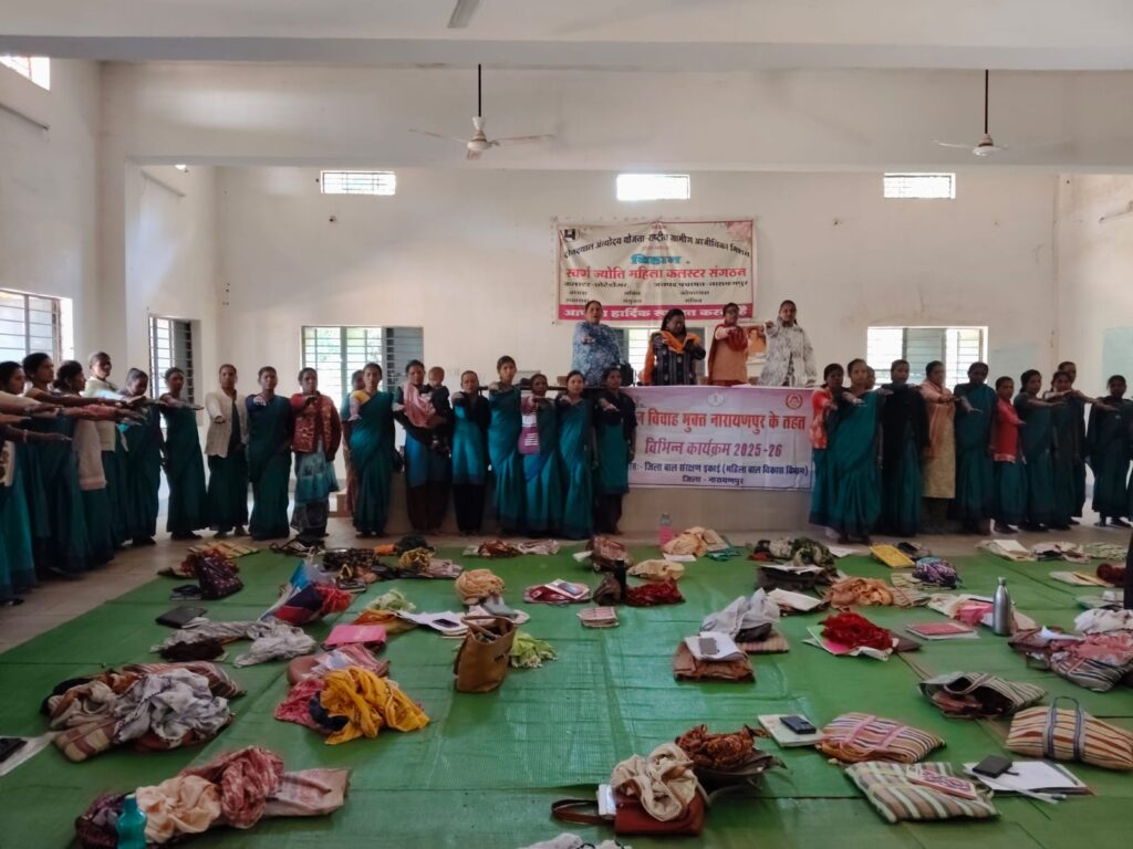 लोकेशन/नारायणपुर – नारायणपुर जिले के छोटेडोंगर में आज बाल विवाह मुक्त अभियान के तहत कार्यक्रम आयोजित कर प्रभारी परियोजना अधिकारी छोटेडोंगर श्रीमती शैंल उसेंडी के द्वारा आंगनबाड़ी कार्यकर्ताओं को बाल विवाह रोकथाम हेतु सामूहिक शपथ दिलवाई गई एवं बाल विवाह से होने वाले दुषपरिणाम से विस्तार से अवगत कराया। बताया की बाल विवाह का अर्थ है समाज जहाँ 18 साल से कम उम्र की लड़कियों और 21 साल से कम उम्र के लड़कों का विवाह होता है, जिसे बाल विवाह प्रतिषेध अधिनियम, 2006 द्वारा भारत में प्रतिबंधित किया गया है, सरकार (महिला एवं बाल विकास मंत्रालय) और विभिन्न संगठन मिलकर लगातार बाल विवाह मुक्त भारत अभियान के माध्य्म से जागरूकता और रोकथाम के प्रयास करते हुए सघन अभियान चलाया जा रहा हैं, कोई भी व्यक्ति बाल विवाह से सम्बंधित शिकायत 1098 या 112 या 181पर कॉल करके दर्ज करा सकते हैं।