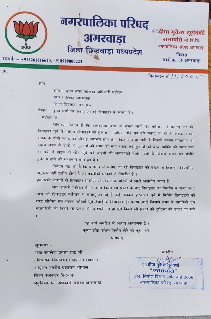 अमरवाड़ा/छिंदवाड़ा। अमरवाड़ा नगर पालिका परिषद के वार्ड क्रमांक 6 की पार्षद दीपा मुकेश सूर्यवंशी द्वारा की गई शिकायत को गंभीरता से लेते हुए अमरवाड़ा अनुविभागीय अधिकारी (एसडीएम) हेमकरण धुर्वे ने संबंधित मामले में जांच के आदेश जारी कर दिए हैं।