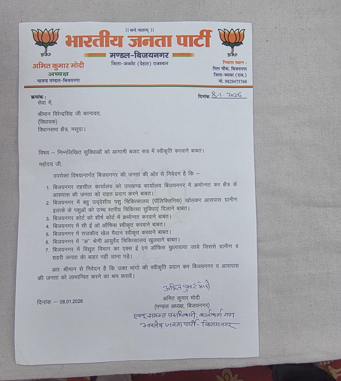 बिजयनगर (राजस्थान)। भारतीय जनता पार्टी मंडल बिजयनगर के अध्यक्ष अमित कुमार मोदी ने आने वाले राज्य बजट सत्र 2026 के मद्देनज़र क्षेत्र की प्रमुख जन-आवश्यकताओं को लेकर एक मांग पत्र स्थानीय विधायक वीरेंद्र सिंह कानावत को सौंपा। यह मांग पत्र बिजयनगर एवं आसपास के ग्रामीण क्षेत्रों के सर्वांगीण विकास को ध्यान में रखते हुए तैयार किया गया है।