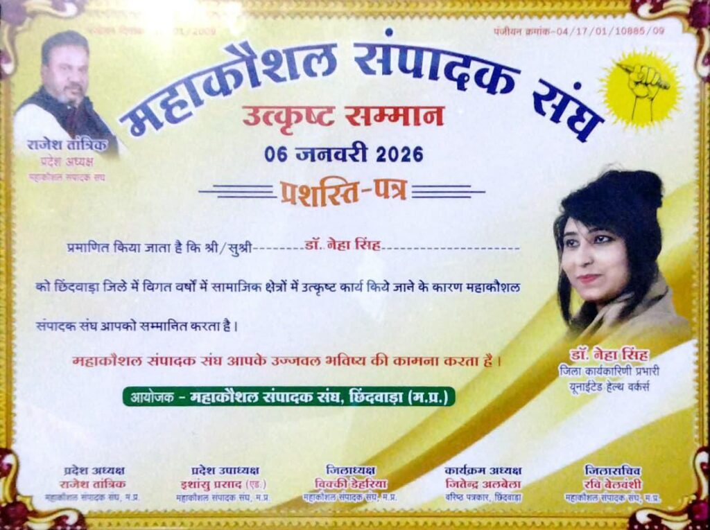 छिंदवाड़ा: समाजसेवा, महिला सशक्तिकरण, पत्रकारिता और जनकल्याण के क्षेत्र में निरंतर समर्पित योगदान देने वाली छिंदवाड़ा की प्रसिद्ध समाजसेवी एवं अतुल्य भारत चेतना की जर्नलिस्ट डॉ. नेहा सिंह को महाकौशल संपादक संघ ने प्रतिष्ठित “उत्कृष्ट सम्मान” से सम्मानित किया है। यह सम्मान 6 जनवरी 2026 को छिंदवाड़ा में आयोजित एक भव्य सम्मान समारोह में प्रदान किया गया।