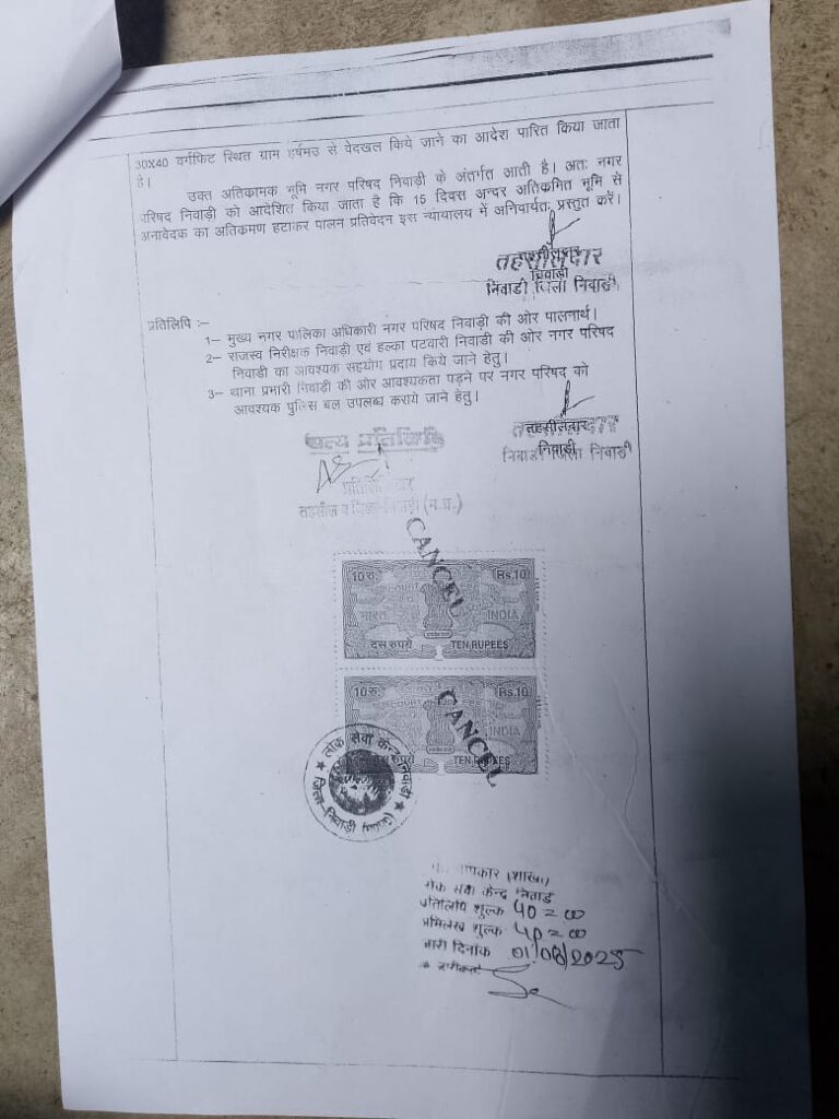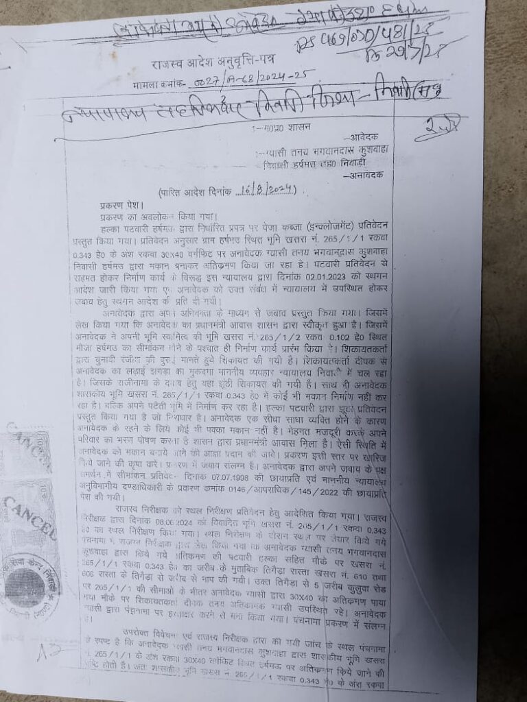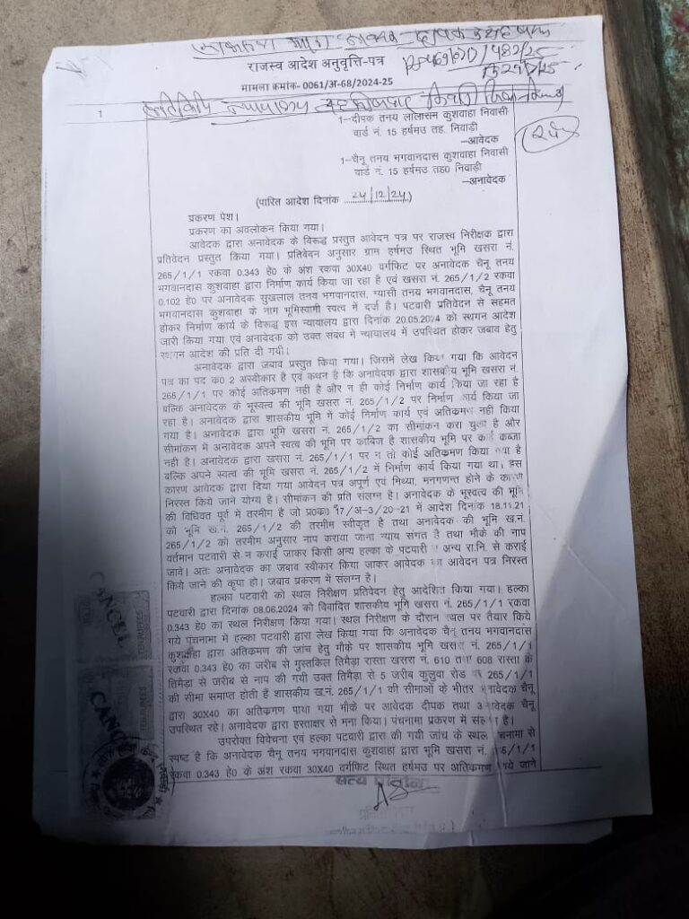 मामला निवाड़ी तहसील के अंतर्गत हर्षमऊ से जुड़ा है, जहां आवेदक दीपक कुशवाहा द्वारा प्रस्तुत प्रकरण पर तहसीलदार न्यायालय ने 5 मई 2025 को स्पष्ट निर्देश जारी किए थे। आदेश के अनुसार, संबंधित भूमि खसरा नंबर 265/1/1 (रकबा 0.343 हे.) के अंश रकबा को शासकीय दर्ज कर संरक्षित रखने के निर्देश दिए गए थे। इसके बावजूद कब्जाधारियों द्वारा प्रशासनिक आदेशों की धज्जियां उड़ाते हुए सरकारी जमीन पर अवैध निर्माण प्रारंभ कर दिया गया।