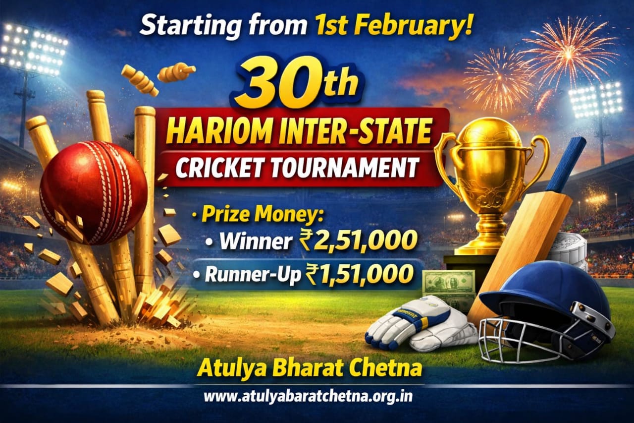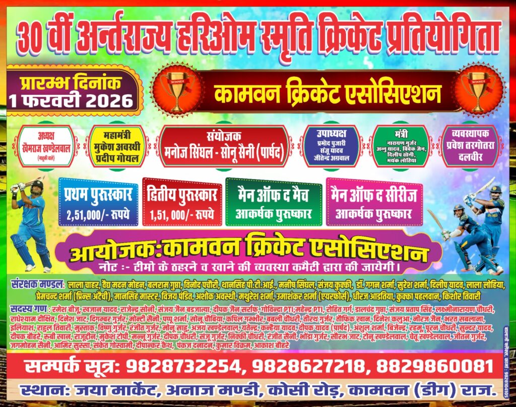 कामां (राजस्थान): कामां-कामवन क्रिकेट एसोसिएशन के तत्वावधान में वर्षों से सफलतापूर्वक आयोजित की जा रही प्रतिष्ठित हरिओम स्मृति अंतर्राज्यीय क्रिकेट प्रतियोगिता का 30वां संस्करण 1 फरवरी 2026 से शुरू होने जा रहा है। यह टूर्नामेंट क्रिकेट प्रेमियों के लिए एक बड़ा उत्सव होने वाला है, जिसमें विभिन्न राज्यों और पड़ोसी देशों की मजबूत टीमें हिस्सा लेंगी।