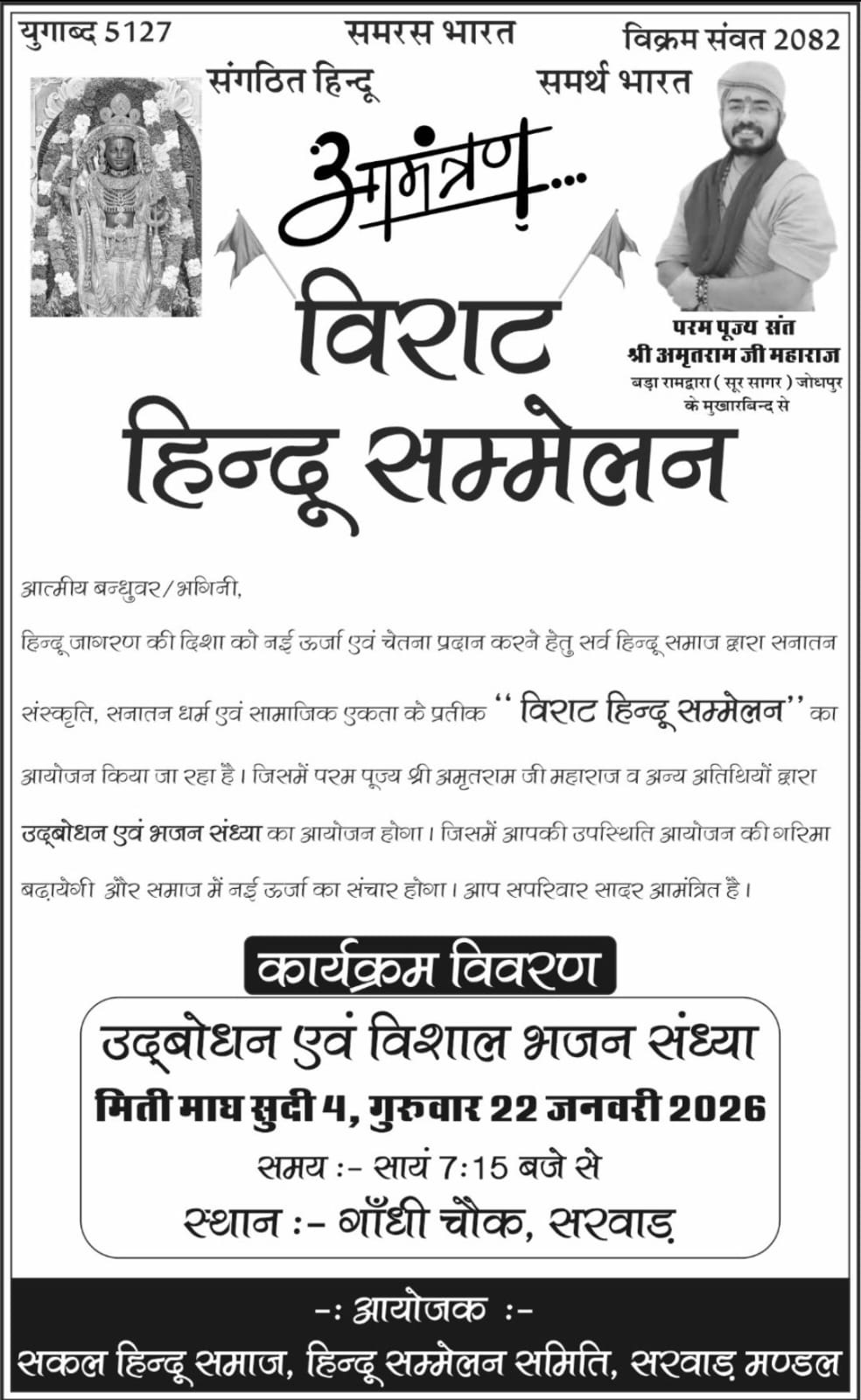 सरवाड़ (अजमेर)। स्थानीय गांधी चौक में आगामी 22 जनवरी 2026 (गुरुवार) को भव्य ‘विराट हिन्दू सम्मेलन’ का आयोजन किया जाएगा। इस सम्मेलन का आयोजन सकल हिन्दू समाज एवं हिन्दू सम्मेलन समिति, सरवाड़ मण्डल के संयुक्त तत्वावधान में किया जा रहा है। कार्यक्रम का मुख्य उद्देश्य हिन्दू समाज में सामाजिक जागरूकता, एकता एवं सनातन संस्कृति के मूल्यों का प्रचार-प्रसार करना है।